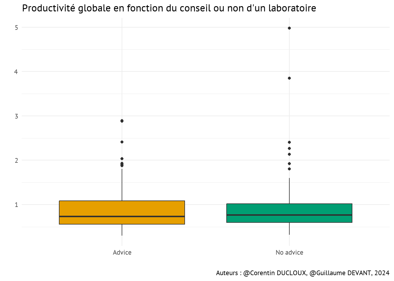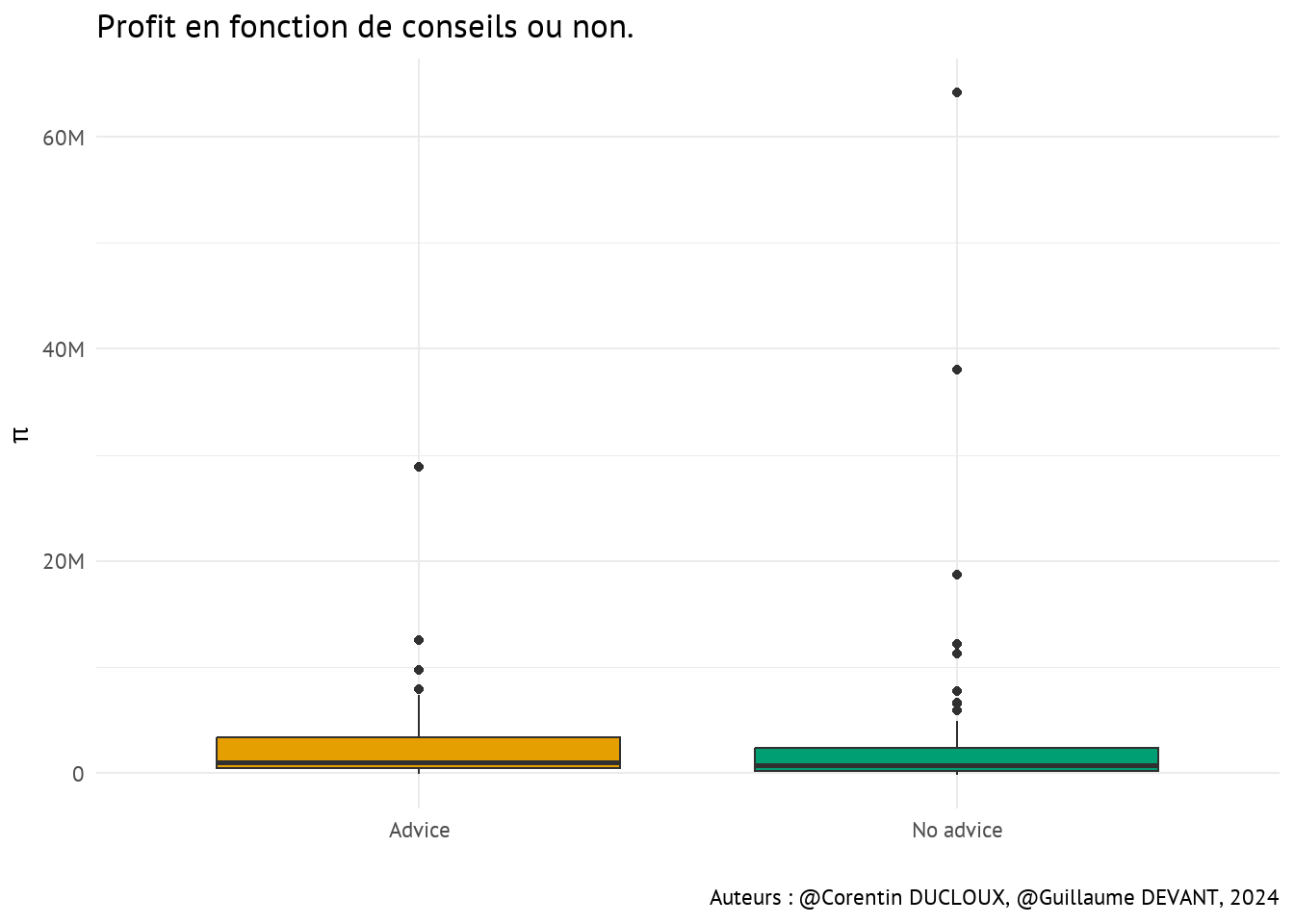 On remarque quelque chose d’intéressant : la médiane des profits des producteurs recevant des conseils est bien plus élevée (1049160) que ceux ne recevant pas de conseils (709112.3)