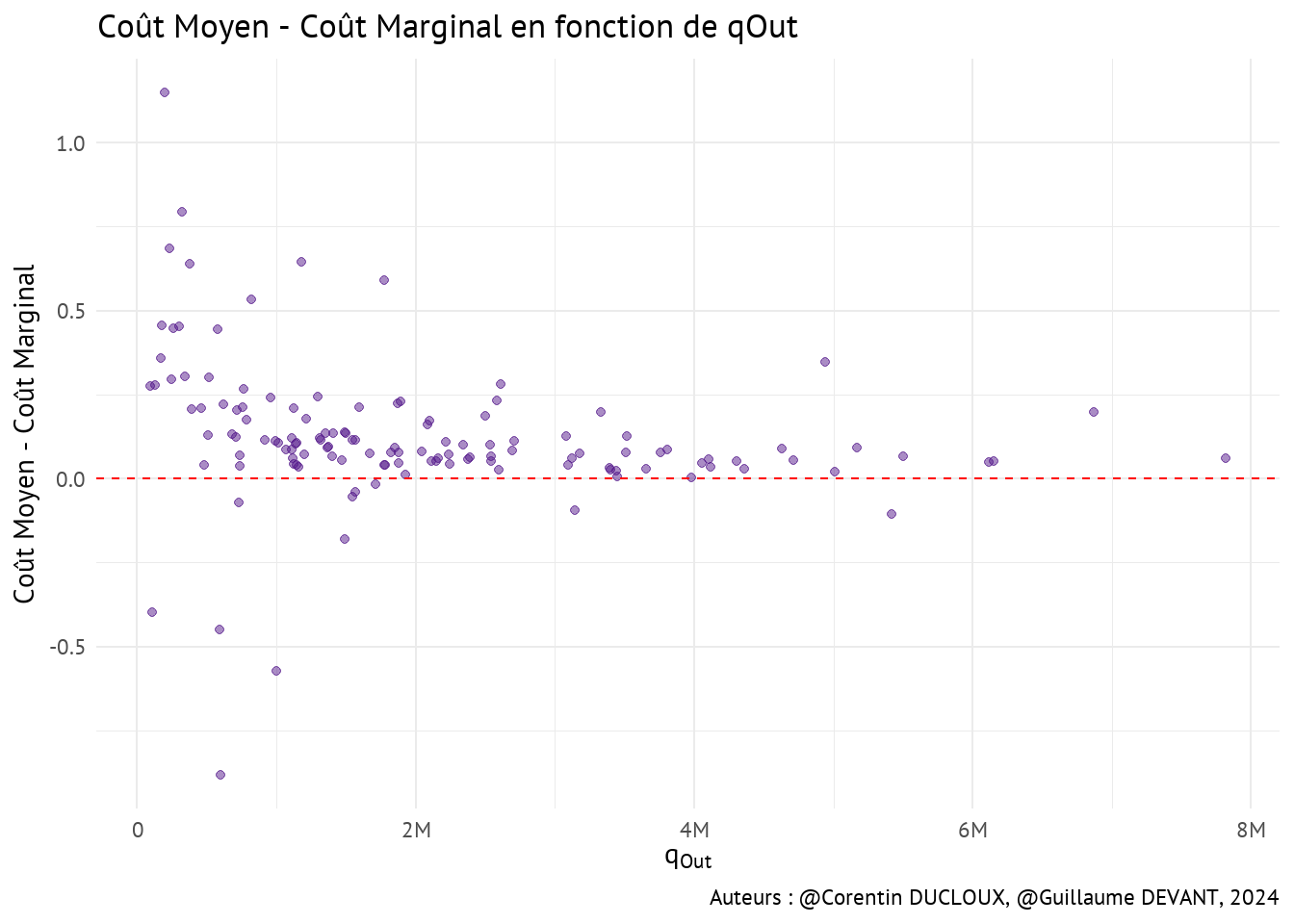 On peut ensuite analyser la différence entre le coût marginal et le coût moyen (le coût marginal que nous utilisons est celui calculé en Section 5.4.1).