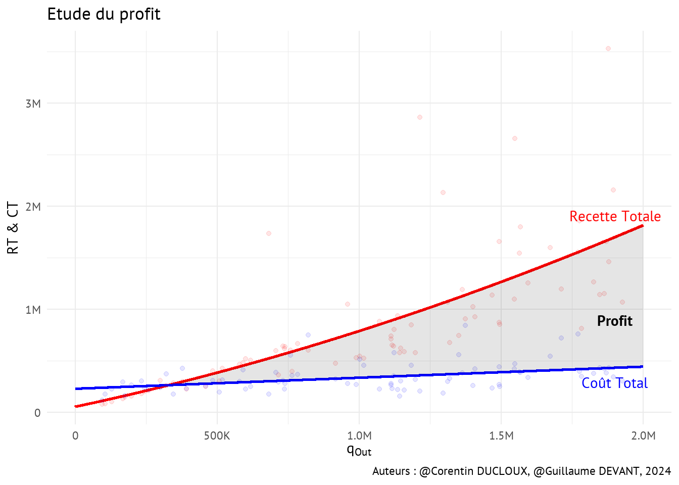 On peut également tracer les courbes correspondant à la recette totale (RT) et au coût total (CT). La relation entre RT et la quantité produite est estimée de manière quadratique