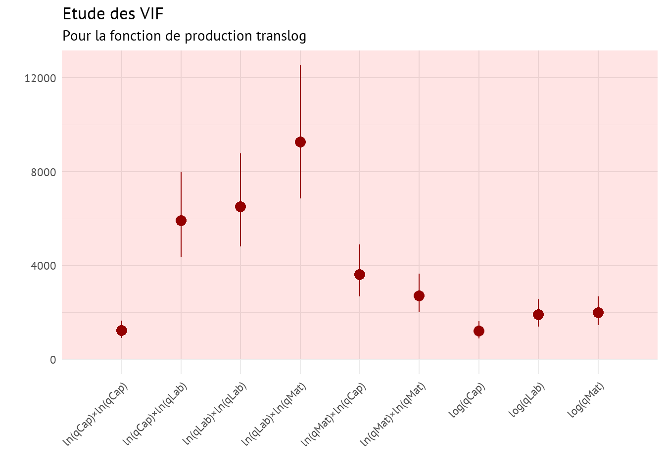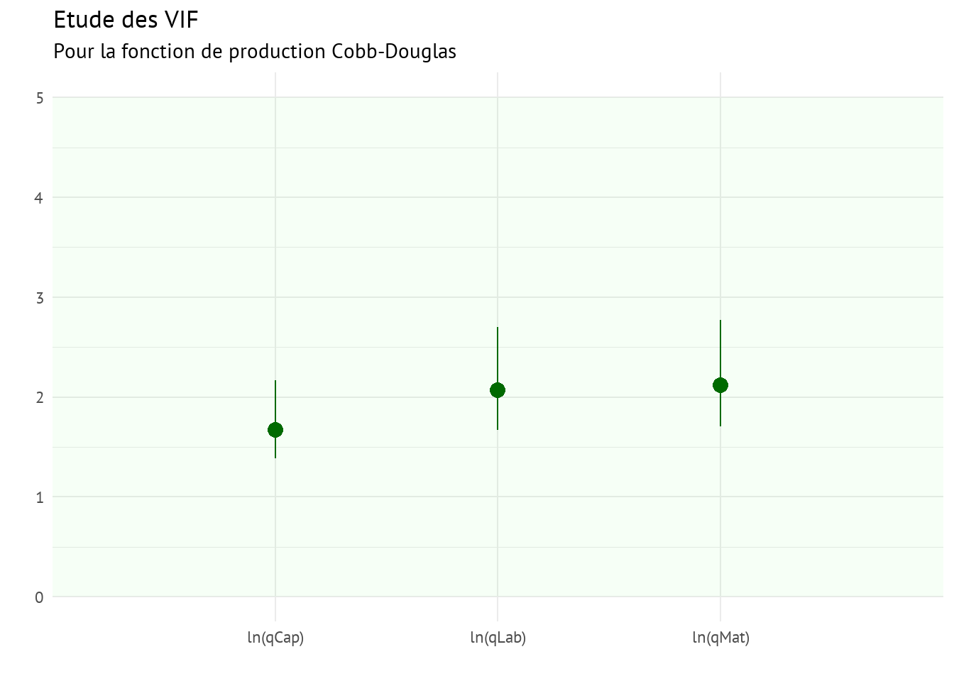 Le problème dans notre cas avec la fonction de coût translog est que nous n’avons que quatre coefficients significatifs sur les 15 estimés. Cela rend la fonction plus difficile à estimer pour effectuer des prédictions, et les résultats ne sont pas nécessairement plus intéressants ni meilleurs que ceux de la fonction Cobb-Douglas de court terme que nous avions estimée précédemment (on peut notamment s’en convaincre en comparant les valeurs de